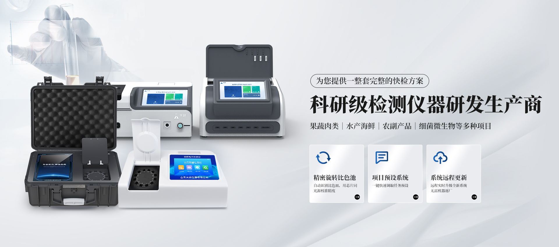 食品安全檢測儀 農藥殘留檢測儀 獸藥殘留檢測儀 細菌微生物檢測儀 食品添加劑檢測儀 食安現場快檢箱 土壤養分檢測儀 植物生理檢測儀 更多